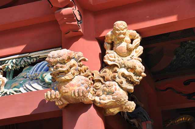 一般的には、切妻式の棟や建物の台座など、加重が掛かる場所の装飾彫刻には、 力士像が有りますが、妻沼聖天山本殿・奥殿で見たものは、猿の彫り物でした。