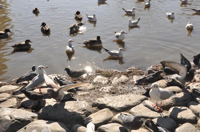 鎌倉鶴岡八幡宮の源平池のうち、冬でも水のある「源氏池」では、陸群(鳩)と水群(鴨)と海群(カモメ)が壮絶な戦いを繰り広げています。