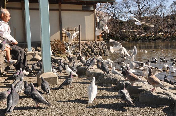 源氏池を縄張りとしている「鴨の群れ」、鶴岡八幡宮の屋根を縄張りとしている「鳩の群れ」、由比ヶ浜を縄張りとしている「カモメの群れ」、そして、湘南海岸を縄張りとしている「トンビの群れ」が、お孫さんを連れて毎日やってくるおじいさんの餌撒きの時間になると、「りくぐん」、「かいぐん」、「すいぐん」が我先にと戦場で個人プレーをしています。