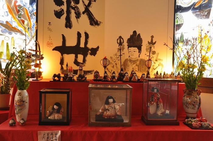 ひな飾りのシーズンは、本堂に市松人形やお雛さまが飾られています。 |