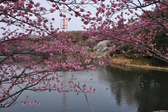 中の池と下の池の間の遊歩道に、新種の「横浜緋桜」が植樹されており、ソメイヨシノとのコラボレーションも楽しめます。 |