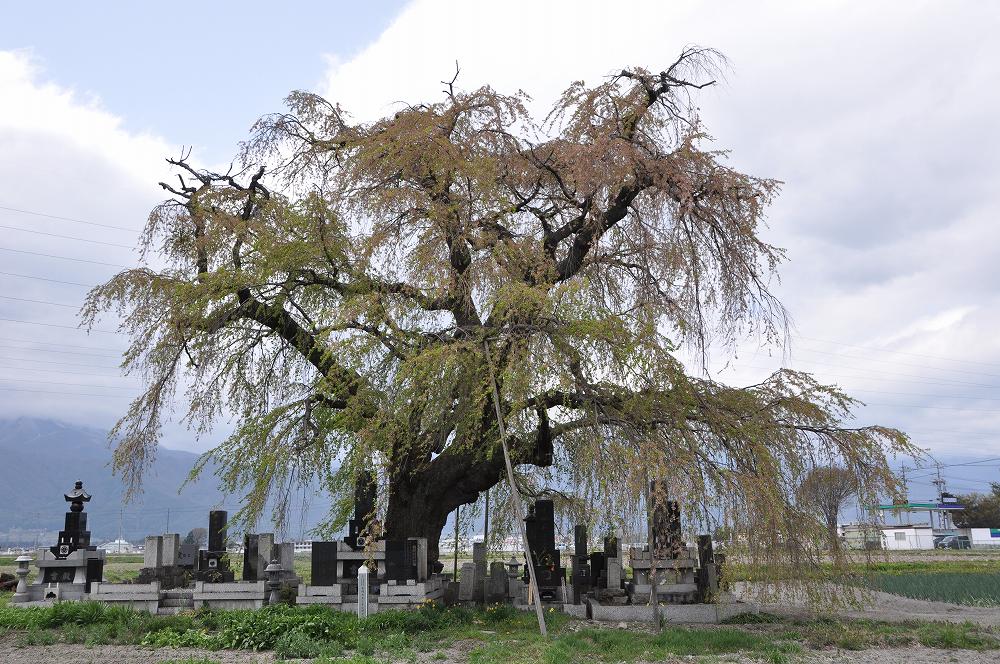 豊科駅近くの県道57号を西に向って走ると、左手に見事な丸い樹冠を付け、墓地のお墓を覆うように枝垂れた桜の花でした。