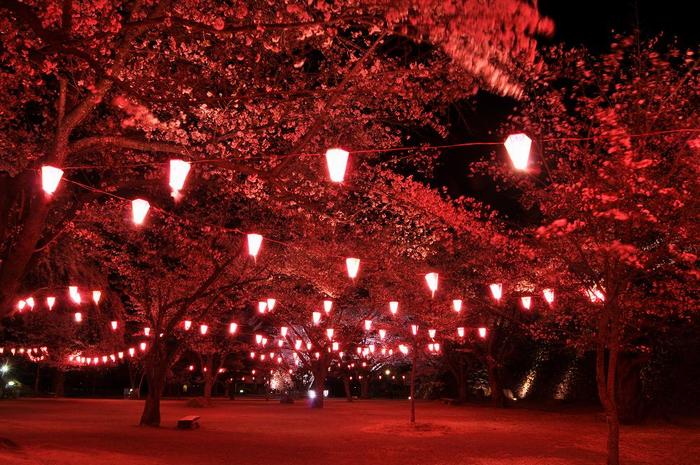 寒波が近づいており、すでに、気温は氷点下、夜桜見物の人出もまばらの中、小諸城内の満開の桜に、ぼんぼりが張り巡らされ、貸し切り状態での撮影でした。 |