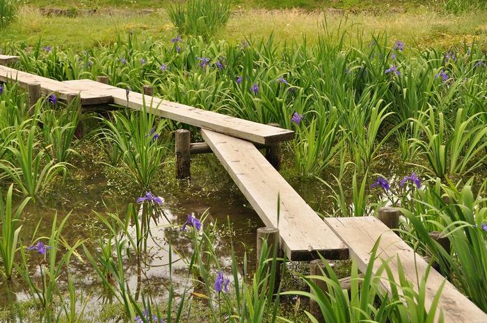 水田に、八つ橋を模した8枚の板を渡し、200株ほどのカキツバタが植えられていますが、水田の広さ