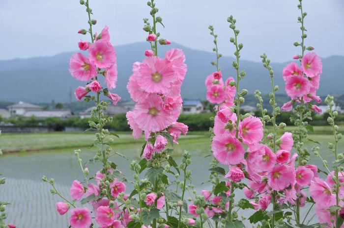あじさいの脇役となっている「ハナアオイ」が淡い色合いで、すくっと伸びた枝に、株の根元から頭の方へ順次大きな花を開き、そよ風に揺れていました。