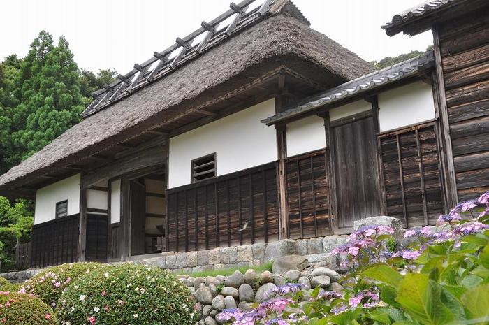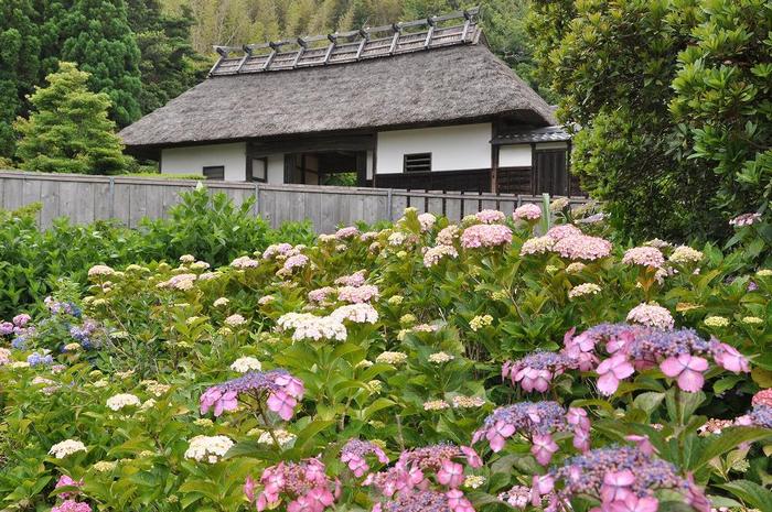 大鐘家屋敷の茅葺き屋根とあじさい |