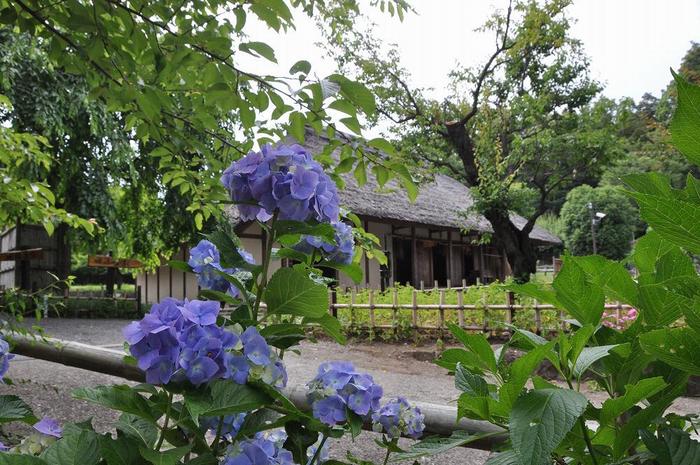 茅葺き屋根とあじさい(大和市郷土民家園)