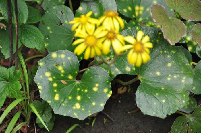 書院の玄関入口に、「斑入りのツワブキ」が有り、緑の葉に丸い斑点で、まるで蛍が光っているようでした。