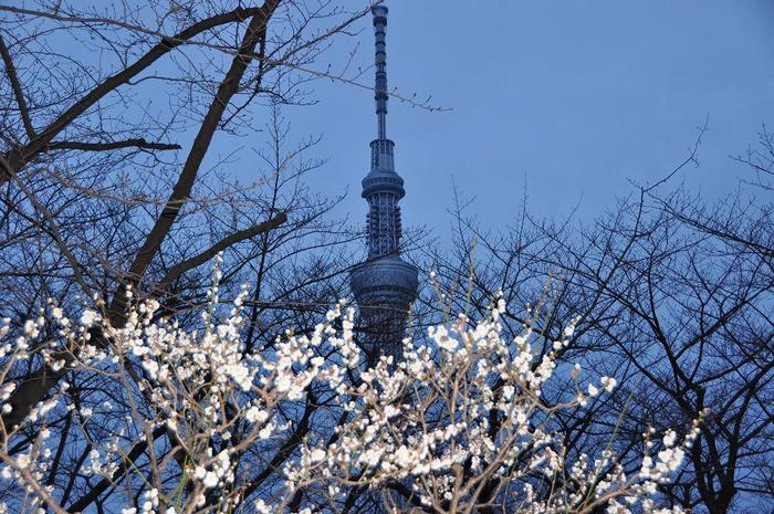 と言うのは、園内に一本通った道を歩いていくと、両側から馥郁とした梅の香りが漂ってくるし、花の上から、東京スカイツリーが姿を見せてくれます。 |