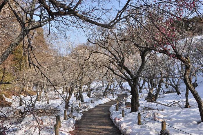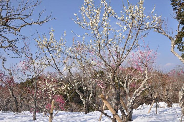2/21現在、6分咲きとの事でした。 さらに、雪害で折れた枝などが痛々しい姿をしていました。