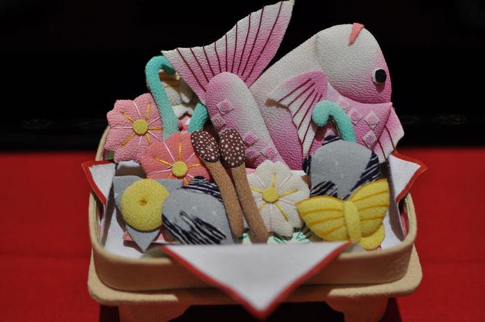 ところで「ちりめん」とは、布の表面に細かいしぼりを出した絹織物です。 『ちりめん細工』は江戸時代後半から、裕福な階層の子女によって受け継がれた日本の伝統手芸てす。 これらの作品を見ていると、ご高齢の方が鼻メガネをして、一針ひとはり根気良く手仕事しているのだろう・・・・・と、感じました。
