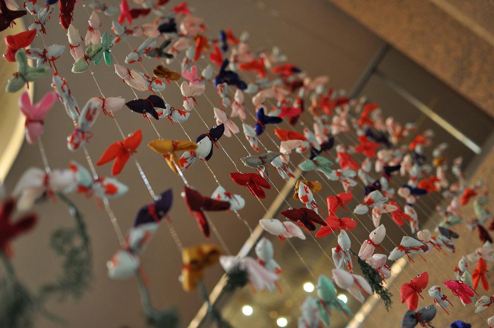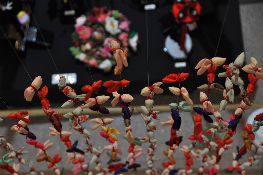 近づいて見ると、6センチほどの大きさの色とりどりの金魚が糸で吊るされていました。 三好代表にメールで確認したところ、900匹の金魚が使用された暖簾の様でした。 望遠レンズで撮影して見ると、縮緬(ちりめん)の布地ならではの温かみが感じられます。 糸の光を捕まえるのに、ピント合わせに苦労しました。
