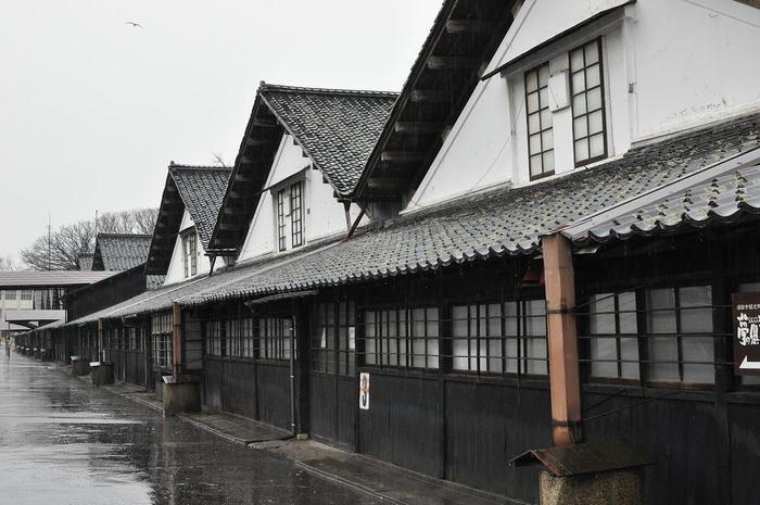 舟による米の積み下ろしに便利な立地で、12棟の巨大な木造の倉庫を連ねた美しい建物と、最上川側のケヤキ並木が独特の風情を伝えています。
