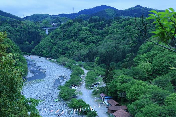 宮ヶ瀬ダムを通り抜け、県道64号を走り、県道413号(道志道)を横切り、県道518号を牧馬峠へ向かう道志川の右岸を走行中、眼下に、道志川の両岸にワイヤーを掛けた鯉のぼりが見えました。場所的には、『青野原オートキャンプ場』の敷地らしいのですが、入口は対岸になっており、やむを得ず、土砂崩れのため、通行禁止になっている遊歩道らしき道を下って行きました。