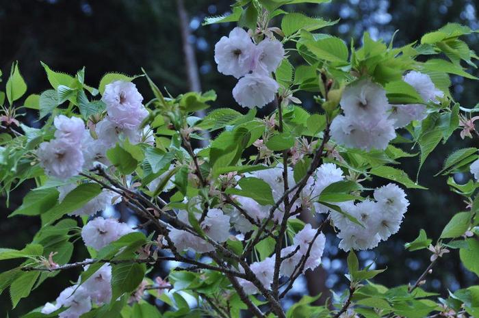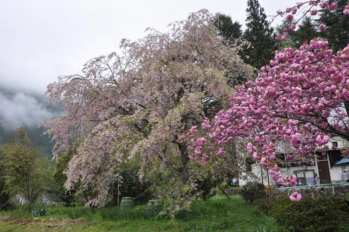 濃いピンクの八重桜は「関山」で、村内ではいたる所で目にした。