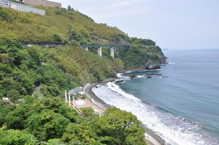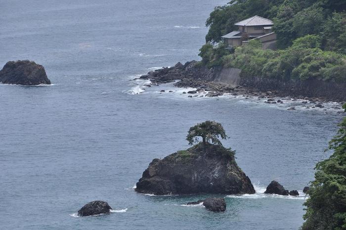 ここ数日、海も穏やかなので、赤潮は赤い帯を伸ばしながら遠ざかり、青い海に溶け込んで行くそうな。 ・・・チョット絵になる光景です。バス停(アカオハーブ&ローズガーデン)近くの海岸テラスに立ち、目を転じると、網代方向に崖下の別荘(個人宅のため近寄れない)といくつかの岩の島(Yahooマップを拡大すると、7つの島が有る)があった。