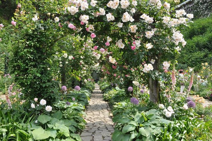 またそのバラを主役としたときに脇役となるジキタリスやルピナスなどの宿根草(しゅっこんそう)を混植し、背景には雄大な風景があるというまるで絵画のようなバラの庭を散策できるようになっています。