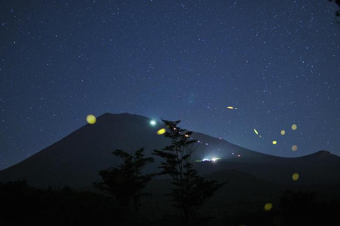 単焦点レンズ35ミリ、f/1.4を使用していますが、富士山までは3キロメートル、ヒメボタルまでは5メートル、ヒメボタルにピントを合わせると、山小屋の照明は〇ボケしてしまい、蛍とのコラボレーションは不可能でした。