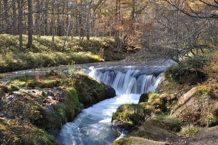 奥日光の湯の湖から流れ出て、戦場ヶ原を静かに縦断して流れる湯川、散策路のしゃくなげ橋の辺りから徐々に高低差が現われ、時として小さな滝を造っています。