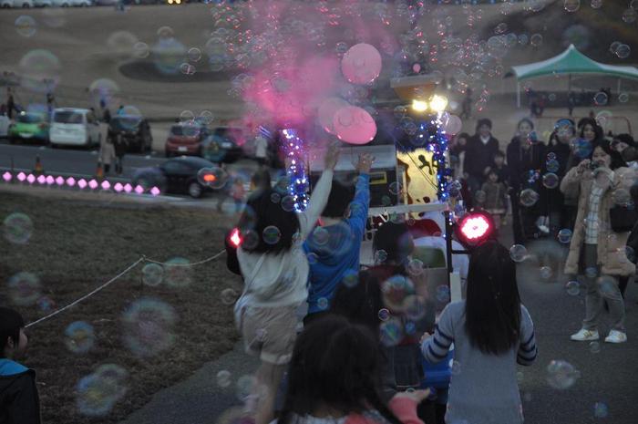 軽自動車並みに走る「しゃぼんカーZ」は、大(直径15センチ)中(直径10センチ)小(直径5センチ)の3種類のシャボン玉(バニラエッセンスを使用しているので、バニラ味がしました)を製造し、後部の扇風機で舞い上がらせ、2灯の照明を当て走り去っていく。