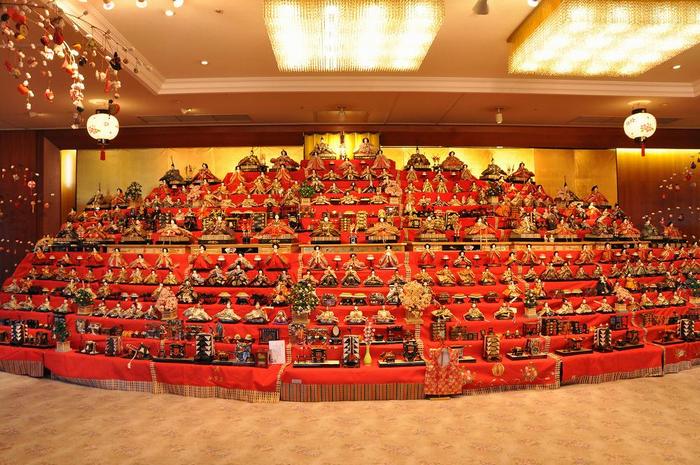 | 伊豆箱根鉄道の「伊豆長岡駅」から徒歩10分ほどで、「ホテルサンバレー富士見」のロビーを特設会場とした『まゆ玉の里』のイベントが有ります。 「ホテルサンバレー富士見」のロビーには、市民から提供を受けたひな人形と、「ビッグひな祭り」を開く徳島県阿波勝浦から借りた合計430体のひな人形を展示した豪華な段飾りが有ります。