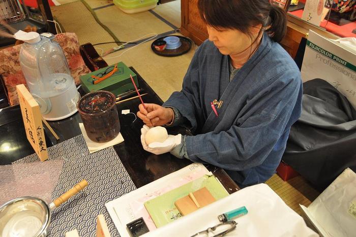 桐塑頭は胡粉を作りかえ、地塗り、中塗り、上塗りを何回も行い、途中、眼切りや胡粉による置き上げなど、多くの工程を経ます。