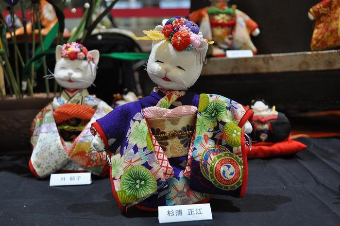ちりめんで作られた高さ約30センチのねこ雛は、メンバーが約3カ月をかけて製作したもので、思い思いの柄の着物を着せています。