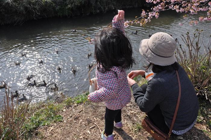川には鴨が食パンをちぎって投げてくれるのを心待ちしています。 |