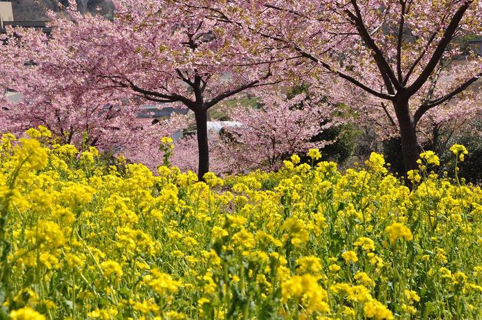 150メートルほど離れた『記念植樹エリア』には、誕生祝や結婚祝などの個人寄付の河津桜と菜の花がコラボレーションしています。