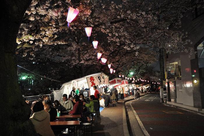 大岡川の両岸の桜並木がライトアップされており、露店が並んでいた。 案内板を見ると、桜並木は弘明寺から日ノ出町までの続いており、夜桜見物の人の波に乗ってしまった。 しかし、途中、ぼんぼりの無い所も有ったが京浜急行の駅が遠いので、結局は黄金町駅と日ノ出町駅の中間まで歩いてしまった。