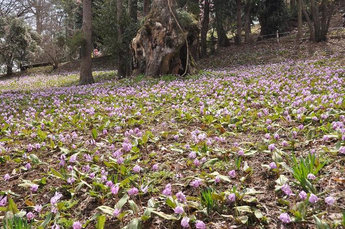 山林の北側斜面3千平方メートルに、カタクリが自生し、南関東随一の群生地として知られています。
