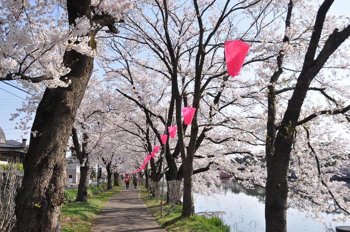 そして、焼け野原となっていた城跡のお堀端に、明治42年(1909)に、在郷軍人会によって2200本の桜が植えられたのが始まりで、その後追加されて行き、現在は4000本有るそうです。夜のとばりがおりると、桜の木に架かっている3000個のぼんぼりに灯が入り、昼とは異なるサクラの下を歩きます。
