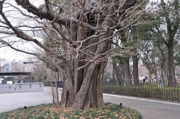 上野公園の中ほどにある「東京都立美術館の裏庭」に、幹の中ほどを鉄の輪で補強された痛々しい姿のイチョウの木が有る。