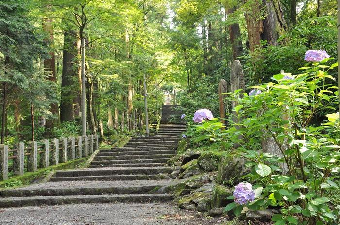 仁王門から始まる参道約3kmには、樹齢500年以上の杉並木(県天然記念物)と車道の両側には1万株のアジサイが咲いています。