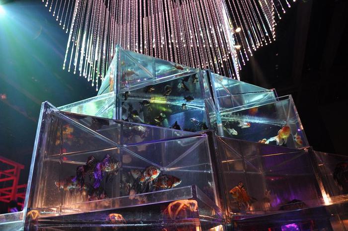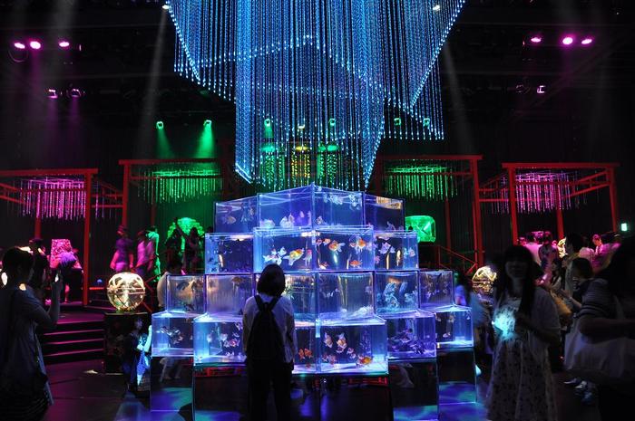 ミラー効果を存分に生かしたアクアリウムの内部を金魚が泳ぐと、合わせ鏡の原理で金魚が無限に存在しているかのように見える神秘的な作品でした。