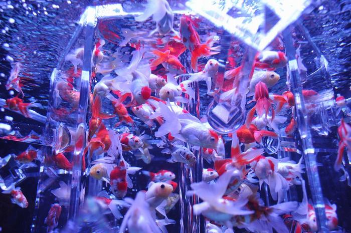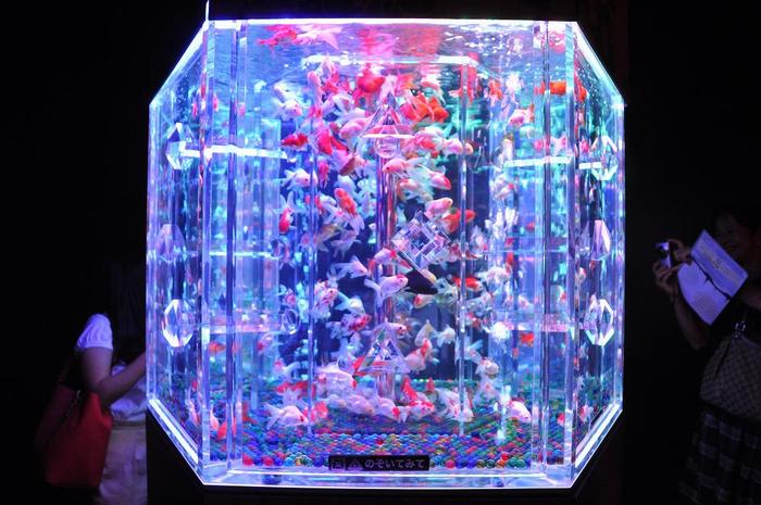 大人気作品である〈カレイドリウム〉を6面体の「万華鏡」として、立体的に再現した作品と紹介していますが、今ひとつ、理解に乏しかった。色とりどりのライトで照らされたアクアリウムの中を金魚が泳ぐと、金魚一匹一匹が持つ固有の模様や尾ひれの動きが、まるで万華鏡の様にキラキラと変化して見え、無限の美の世界が広がります。