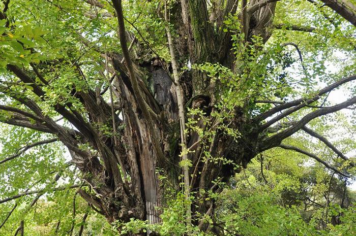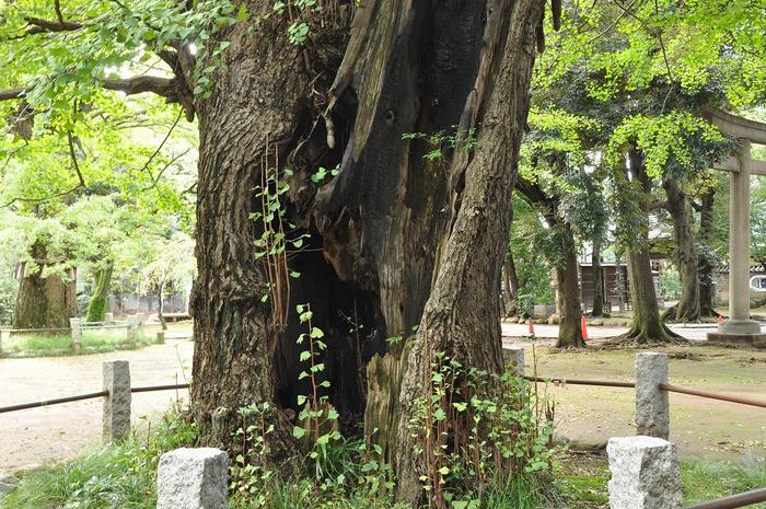 ご神木の標しのシメ縄がある方は、空襲被災のダメージが小さいですが、もう一本のイチョウの樹は倍の太さが有りますが、空襲被災のダメージは大きいです。