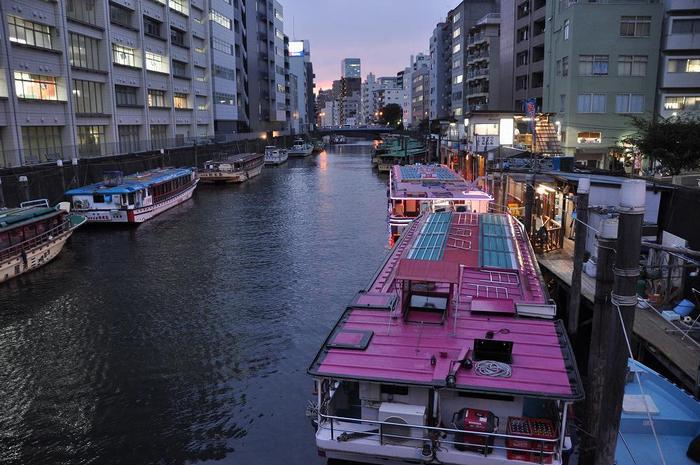 JR浅草橋駅、馬喰町駅、地下鉄東日本橋駅、馬喰横山駅と4ヶ所の駅からそれぞれ徒歩2分ほどの距離に神田川が有り、浅草橋や柳橋付近に6つの屋形船の船宿が有り、沢山の屋形船が停泊しています。