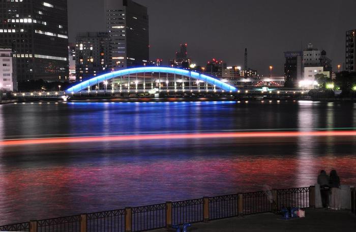 この辺りは、南西に向かう本流と南の方に向かう支流の隅田川の分岐点となっており、パリ広場から北を眺めると、丸いアーチの永代橋が望め、西に目を移せば中央大橋が見えます。