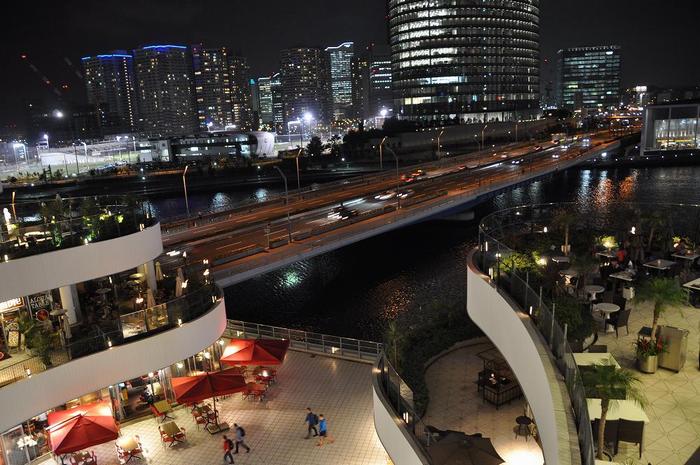 みなとみらいエリアとポートサイド地区を結ぶ、「みなとみらい大橋」の左右に歩道があり、左側の歩道は横浜ベイクオーター・そごう方面、右側の歩道はポートサイド地区やマリノスタウンを中心に夜景を眺められます。橋の歩道なので特に観賞向けの設備があるわけではないのですが、建物が近いため光量も十分にあり、また河川に反射する明かりも綺麗に輝いています。 |