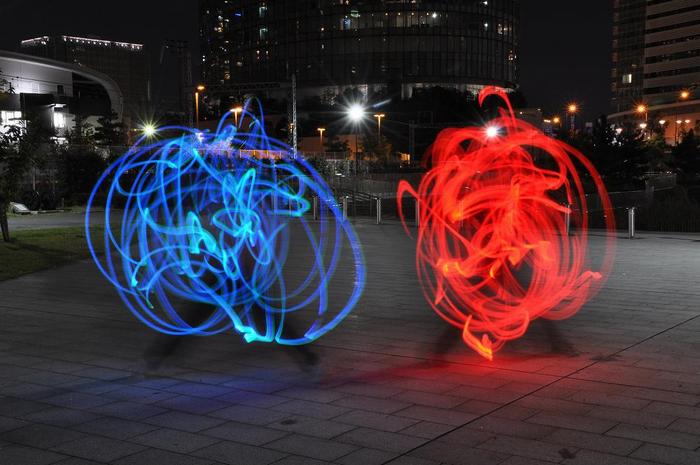 若者の動きを動画撮影しました。 ⇒ クリック近づいて見ると、高校生らしい若者二人が、ペンライトを持って、両手をぐるぐる回していた。