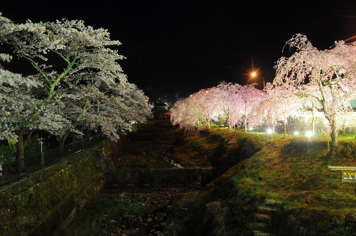明るいうちに「ソメイヨシノの桜並木」を撮影し、復路で、幸いにも消し忘れのライトアップのシダレザクラを撮影できました。