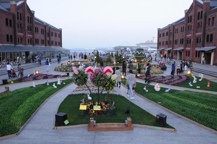 花畑には横浜赤レンガ倉庫創設105周年にちなみ、105体のイースターバニーが様々な造形で登場しています。