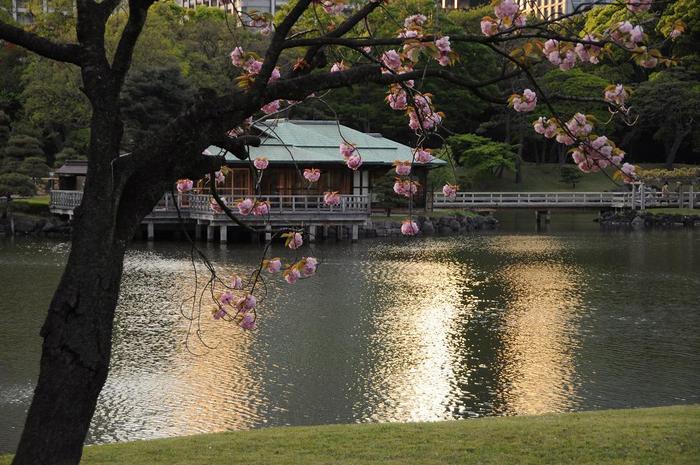 池のまわりに植えられている「イチヨウ(一葉)」、「ギョイコウ(御衣黄)」、「スルガダイニオイ(駿河台匂)」、「カンザン(関山)」、「フゲンゾウ(普賢象)」、「ウコン(鬱金)」などの八重桜は色合いも濃く、花びらの枚数も多く、汐留の高層ビル群を借景に、また、池の中央の「中島の御茶屋」とのコラボレーションも被写体にはもってこいでした。