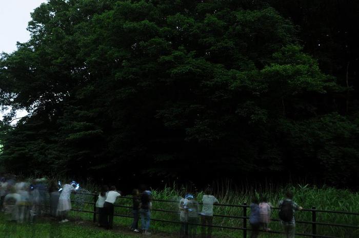 ホタルは雑木林の暗い所から、10メートル離れた観客に近づいて来ようとはしなかった。 |