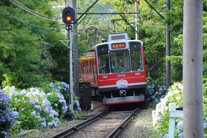 この駅(大平台)のあじさいは、通り抜け可能な「踏切」が多く、撮影ポイントの多いエリアです。