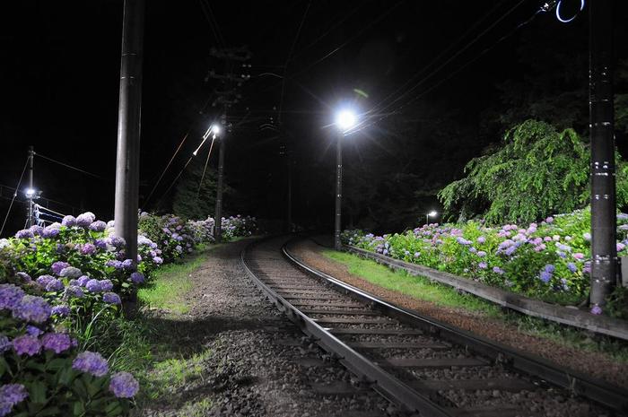駅のそばの踏み切りはスイッチバックのための線路が並行しており、電車が頻繁に通過する為、あじさいと登山電車のコラボは大人気であるが、残念ながら、花の見頃は10日ほど前、ライトアップならば、多少のごまかしは可能である。