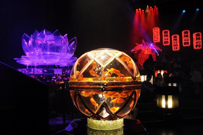 趣向を凝らした水槽のデザインと色とりどりの8,000匹もの金魚の群れ、鮮やかなライトアップが織りなす幻想的な空間は、まるで江戸時代の花街に彷徨いこんだかのようでした。
