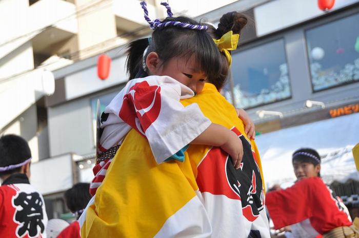 下の2枚の写真は、「めだか連」の年少組、一生懸命練習をしてきたはずなのに、なぜか母親に抱っこされて、涙顔していました。下記の連名をクリックすると、動画をご覧頂けます。