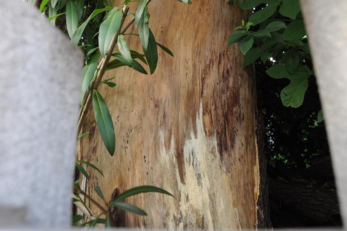 被災木は、蔵前通りに面した木々の間に、幹回り2メートル、高さ6メートルの白蝋化した物が見えた。